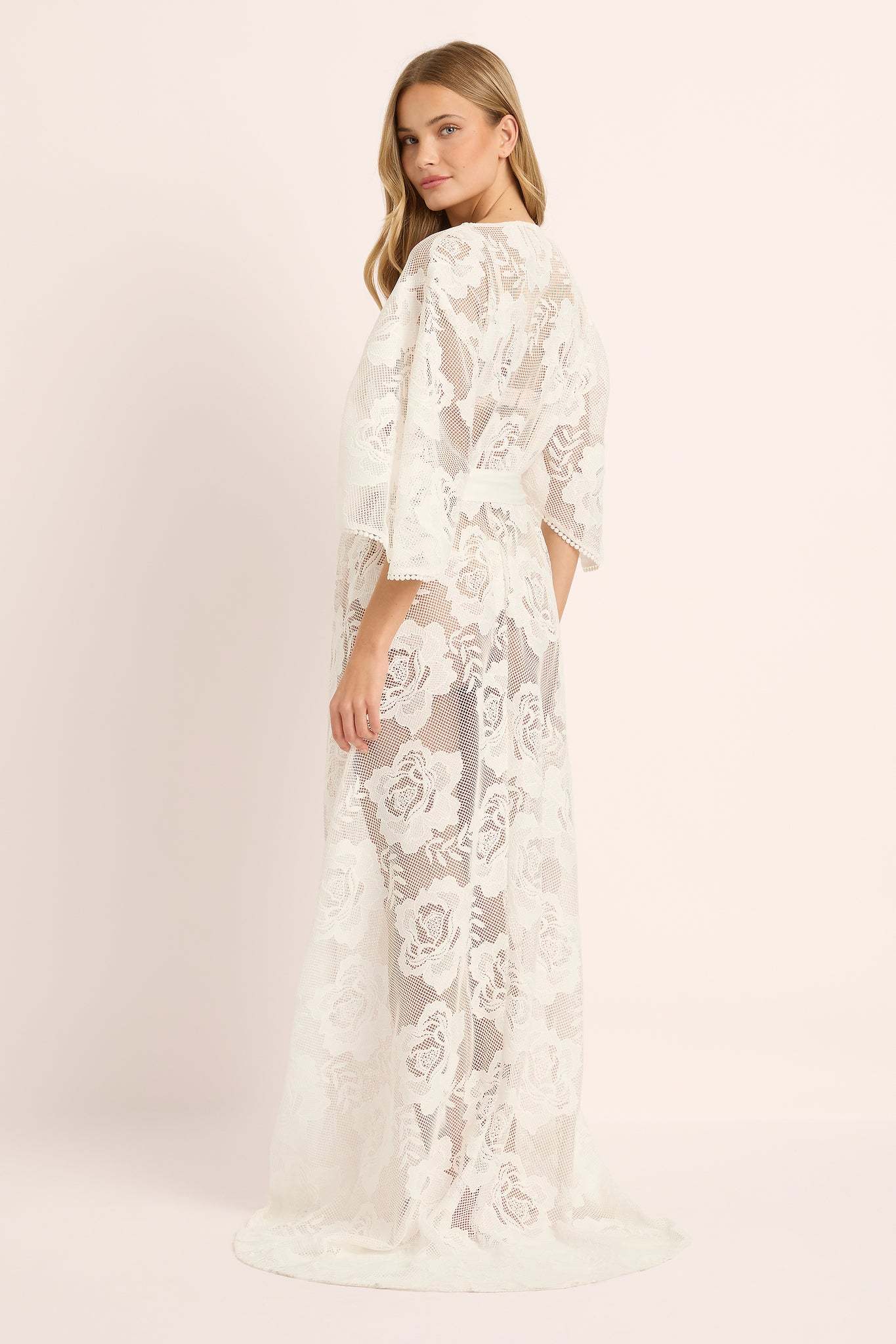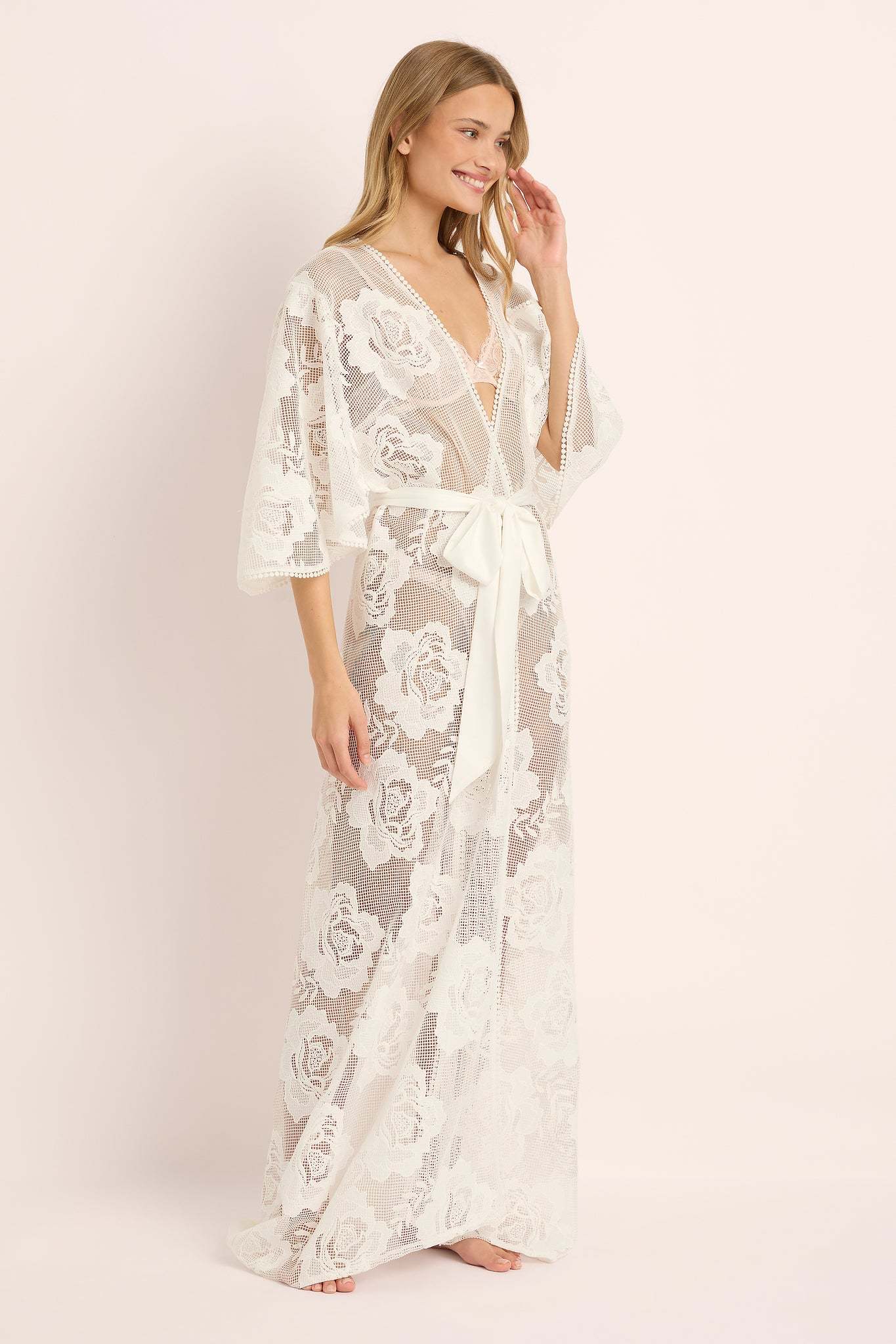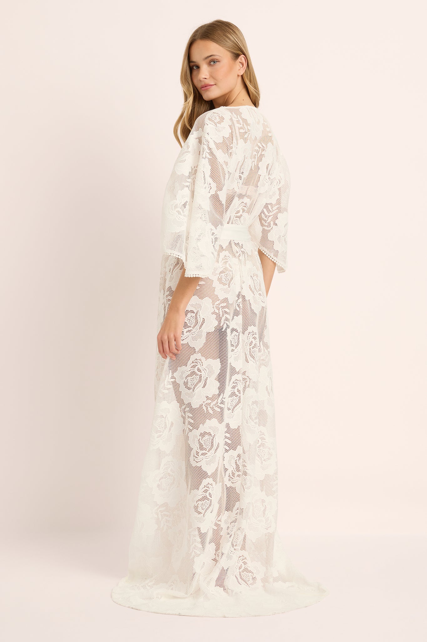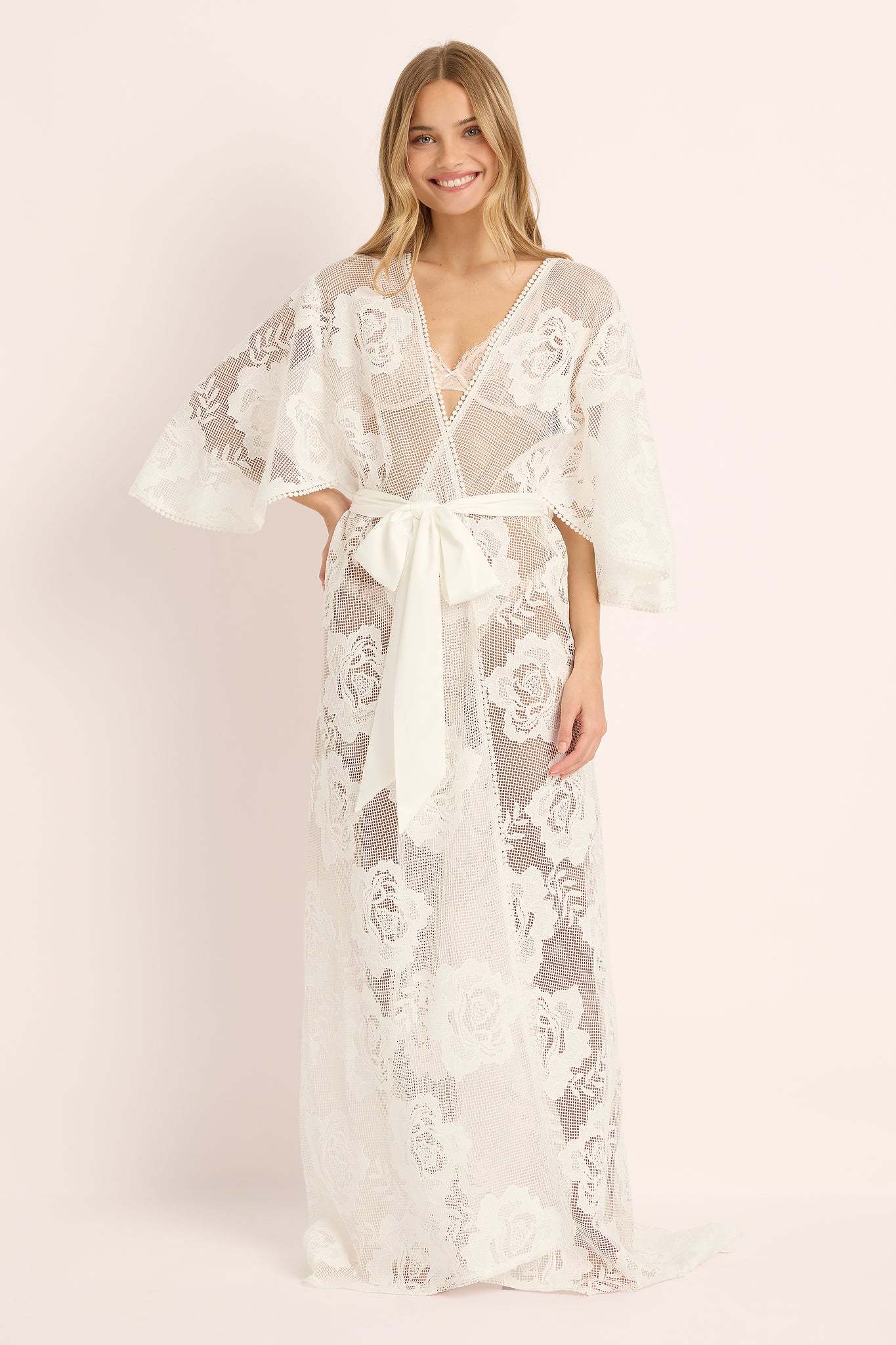 Sheer and beautifully draped, this bridal lace robe ties softly at the waist for a flattering silhouette that feels equal parts romantic and confident. Perfect for bridal party getting-ready photos, honeymoon mornings, or as a stunning cover-up over your favourite lingerie or swimwear.