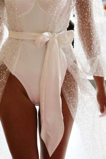 Indulge in the epitome of luxury, sophistication, and elegance with Homebodii's breathtaking Athena Luxury Beaded Bridal Robe. Whether it's for the cherished moments on the morning of your wedding or to add a touch of glamour over a bikini during your honeymoon, this robe is designed to captivate.