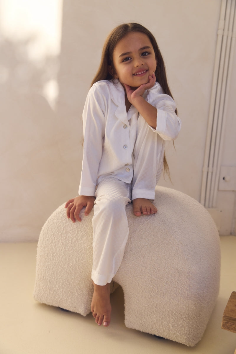 Elevate your child's bedtime with our Gigi Checked Satin Kids Pyjama Set, crafted from OEKO-TEX® certified satin, offers a luxurious feel while ensuring sustainability and safety, free from harmful substances—perfect for comfortable, eco-conscious elegance.