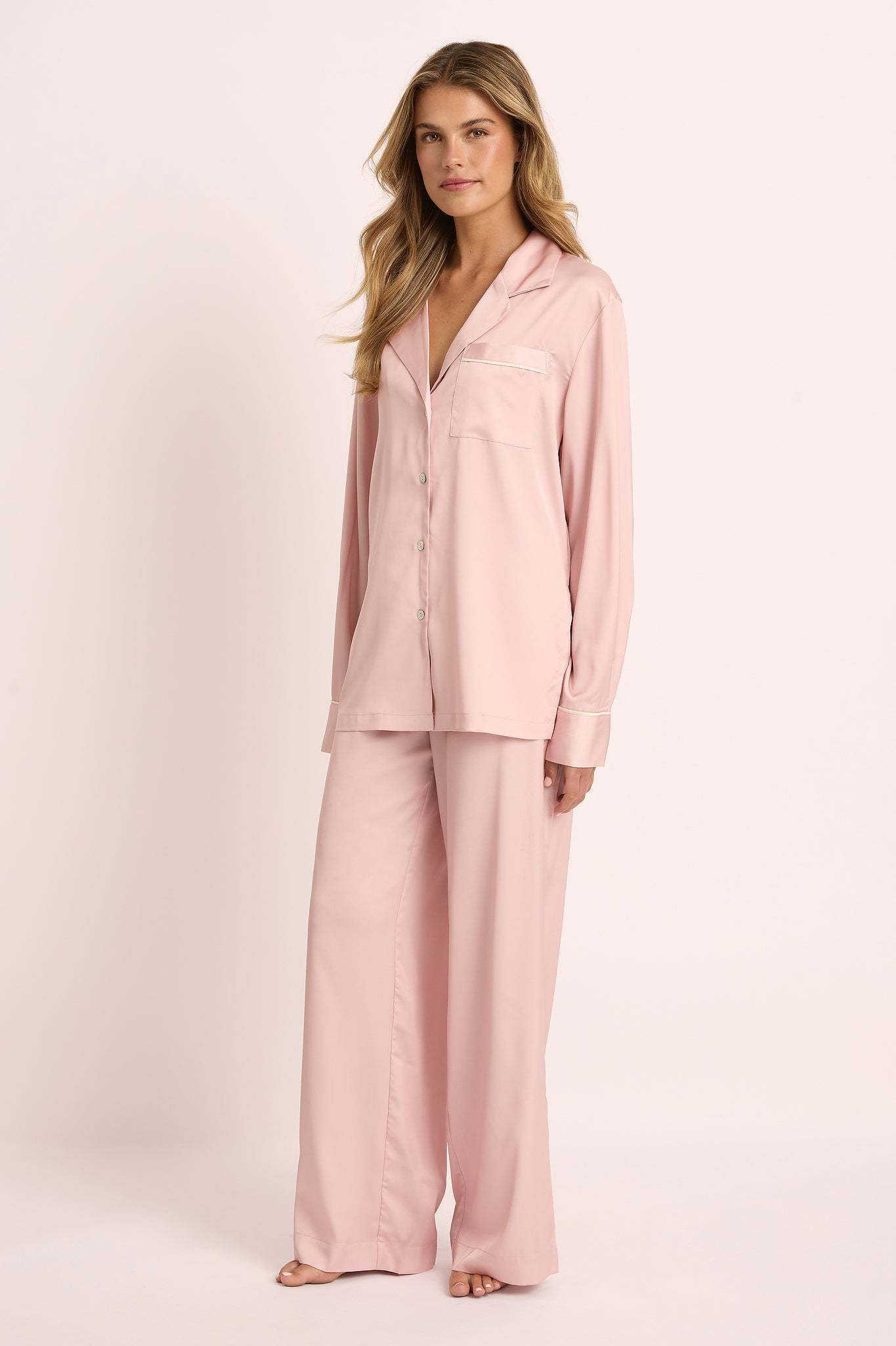 - Long sleeve button-up top with matching long pants