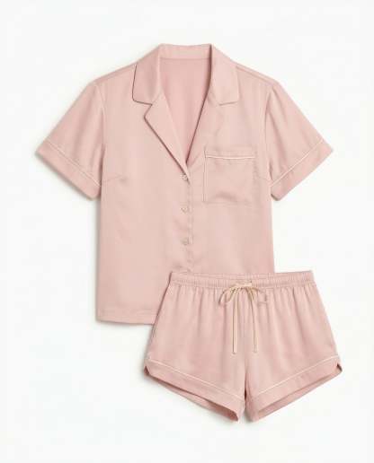- Short sleeve button-up top with matching shorts