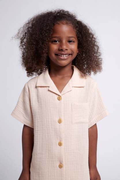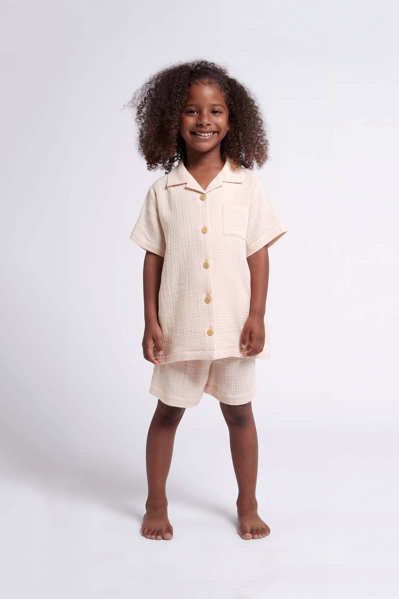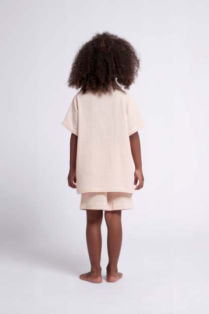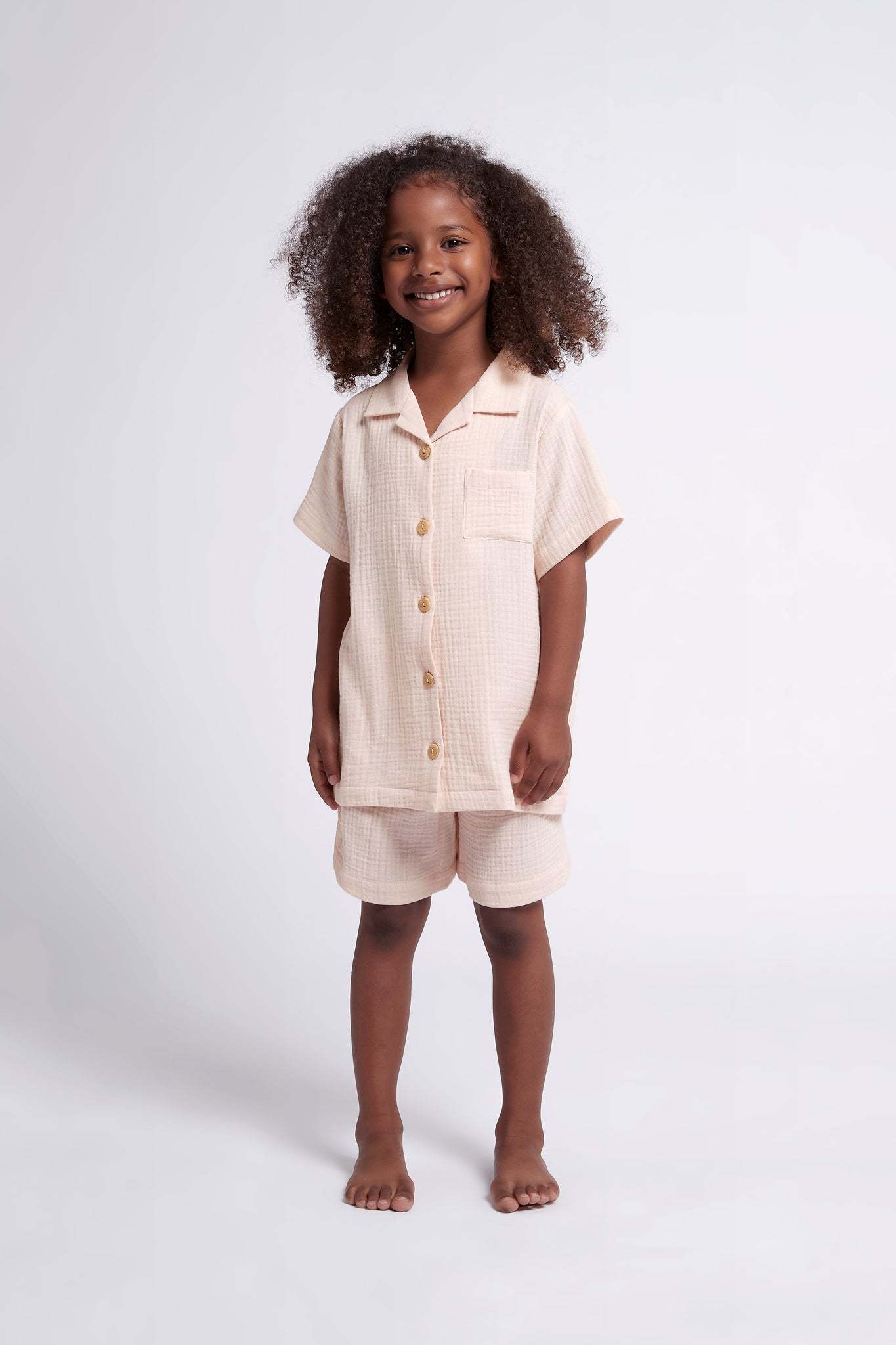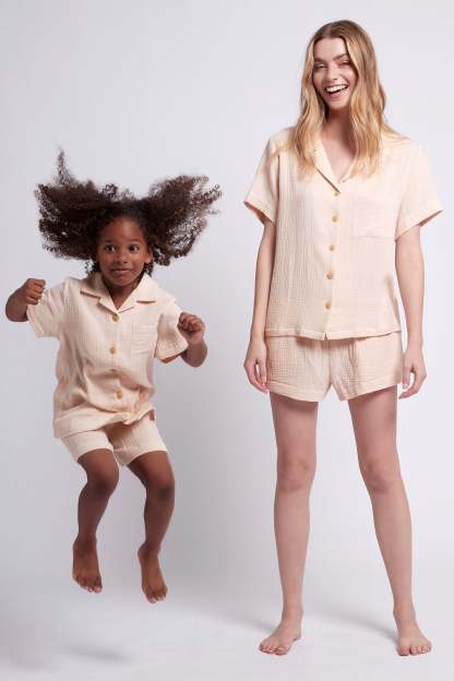 Cute and comfy, our Piper Bubble Cotton Children's Short Pyjama Set is what every little homebody needs this summer. Keeping them cozy and cuter then ever, this PJ set features wooden buttons, and a stretchy waistband for ultimate comfort! Made from 100% cotton, the Piper Bubble Children's set is designed in Australia with a beautiful blush colour. It also matches perfectly with our Women's Piper Bubble set.