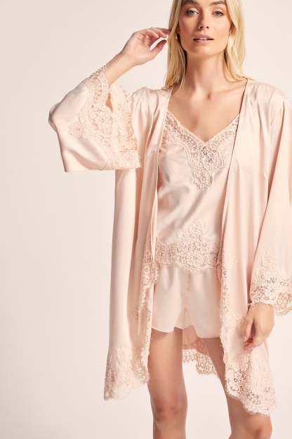 Embrace your daring side with the exquisite Sian Lace Satin Cami Set. Crafted from blush cotton lace with a captivating floral pattern, this set is designed to flatter your figure with its bias cut cami and alluring v-neckline.