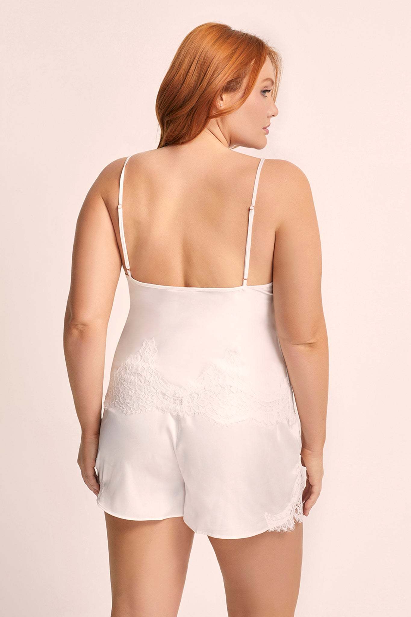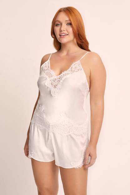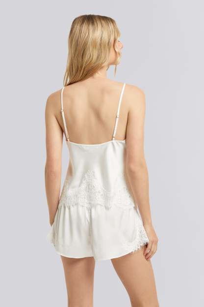 The cami features an alluring v-neckline trimmed with intricate floral lace, while the bias-cut satin drapes beautifully over the body for a flattering, fluid fit. Paired with charming French knicker-style shorts, this set enhances your natural silhouette while offering comfort and ease. Incredibly versatile �?wear the cami on its own with jeans for a chic daytime look, or pair the French knickers with a cardigan for effortless lounging.