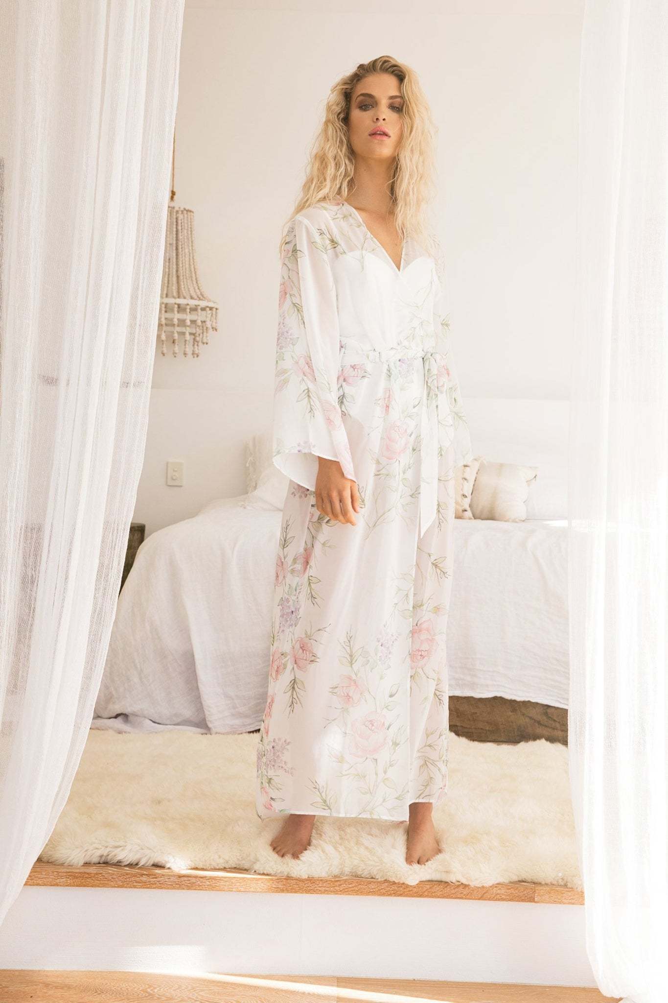 The homebodii? Sofia Maxi Robe in luxurious chiffon fabric will elevate your morning routine, leaving you feeling wonderfully ethereal. Begin each day wrapped in beauty with this exquisite floor-length robe, adorned in our beloved hand-drawn Sofia floral print.