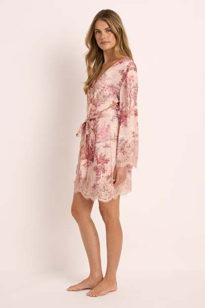 A robe that feels like stepping into a French daydream. The Toulouse Short Robe captures the romance of vintage European landscapes with soft blush tones brushed with scenes reminiscent of pastoral toile de Jouy art.