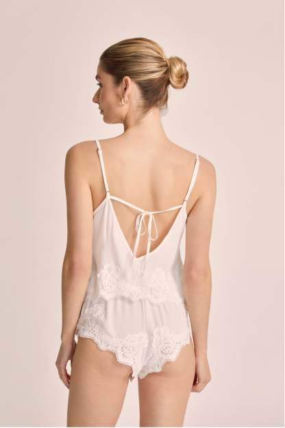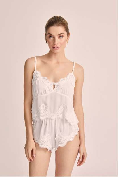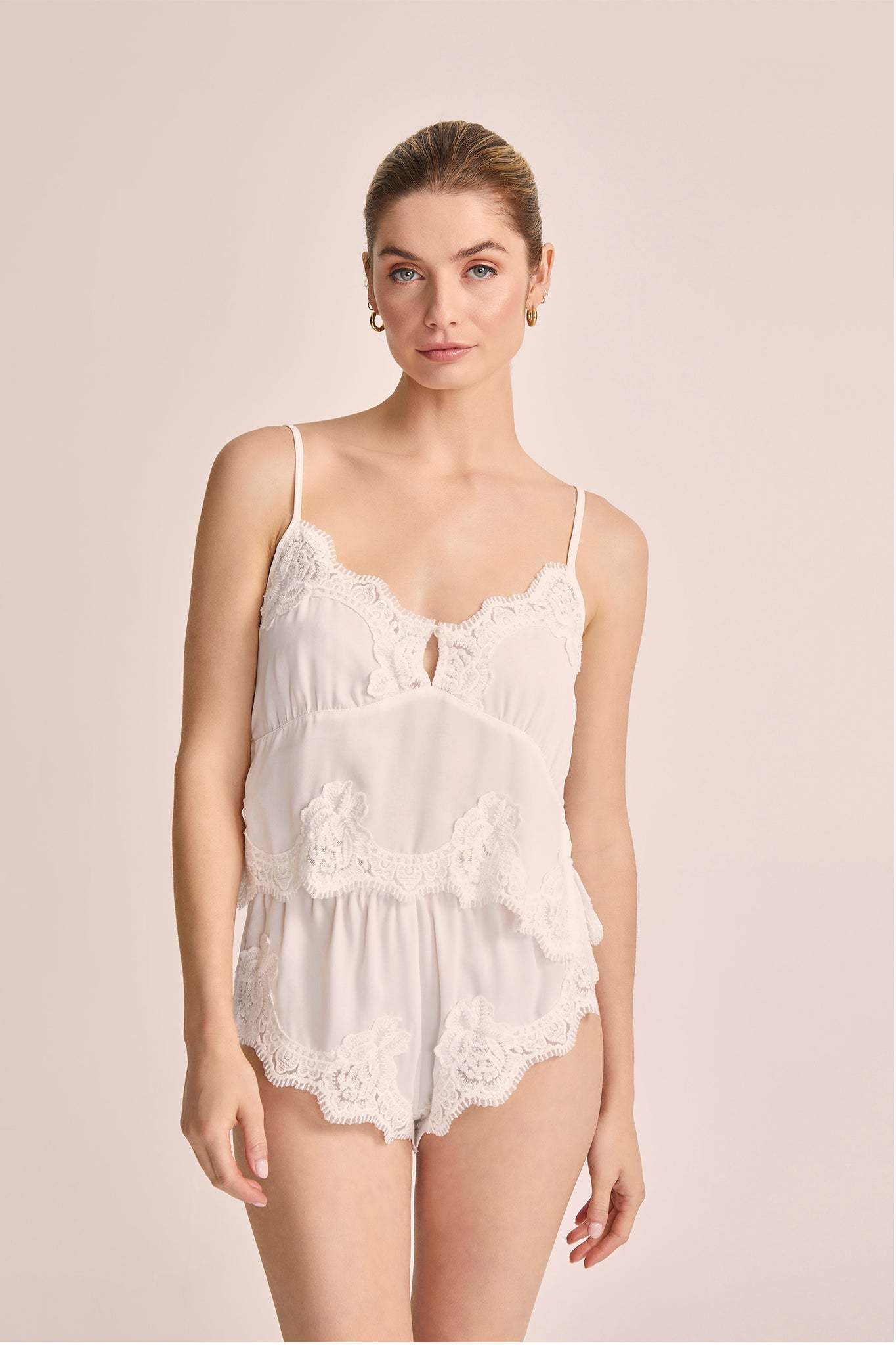 Crafted from semi-sheer lightweight chiffon, the cami top features delicate hand-sewn lace detailing and adjustable spaghetti straps, creating a graceful and flattering silhouette. The matching shorts pair beautifully with our Farrah and Valentina robe, making it ideal for lounging or adding a touch of glamour to your bedtime routine.