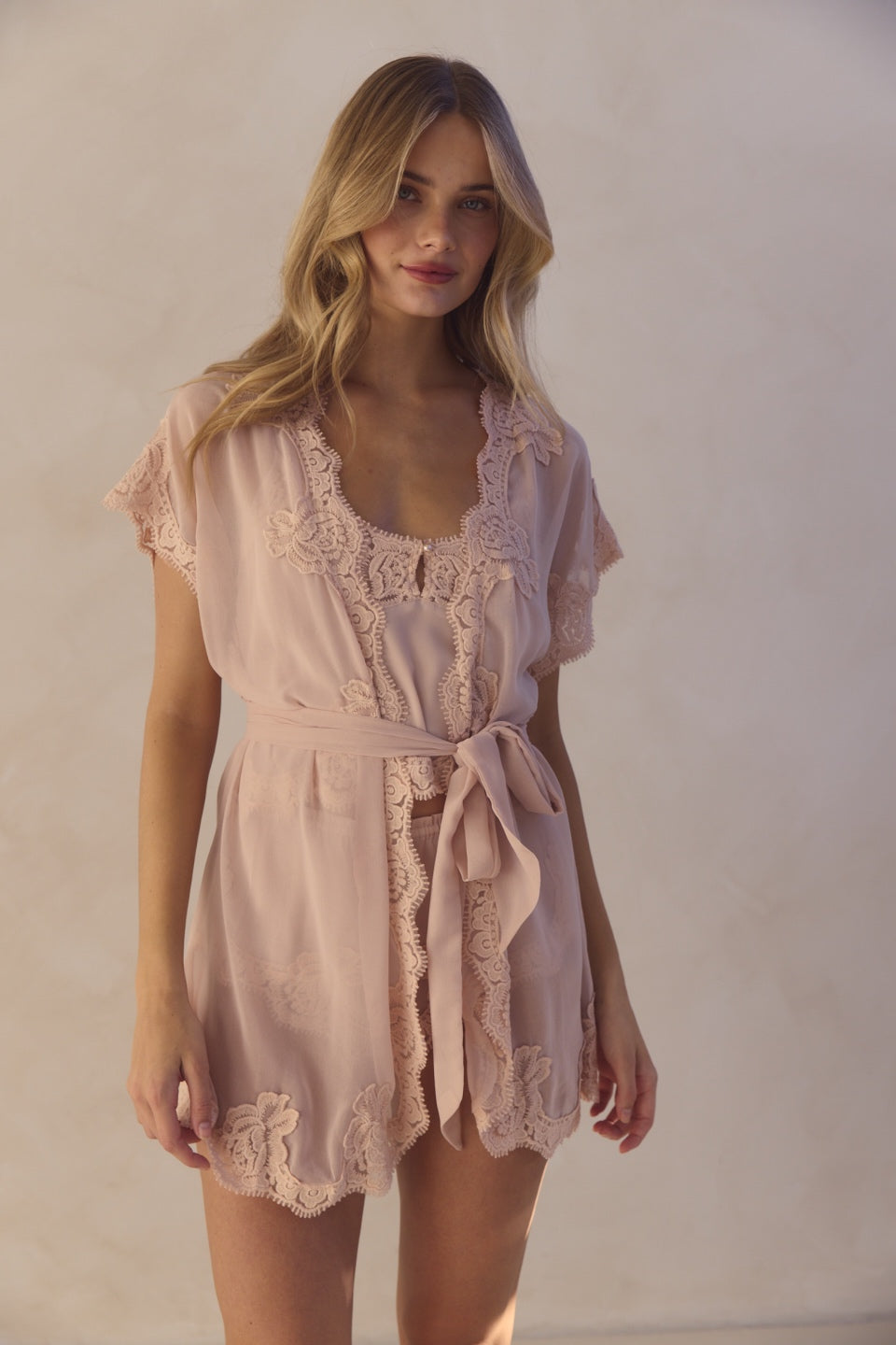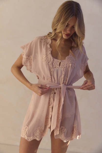 Crafted from luxurious chiffon in beautiful blush with intricate lace detailing along the neckline and sleeves, this mini robe drapes effortlessly with a flowy, graceful silhouette. The contemporary high-low hemline adds a modern twist to its classic design, while short sleeves offer a light, breezy feel. Whether you're getting ready for your wedding morning, enjoying a relaxing day at home, or embracing a quiet evening, this robe envelops you in luxury and style. Pairs beautifully with the Valentina cami set or bodysuit for a complete elegant look.