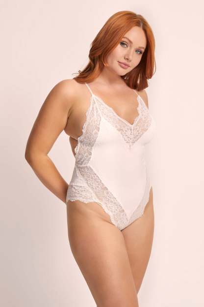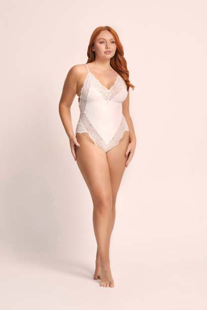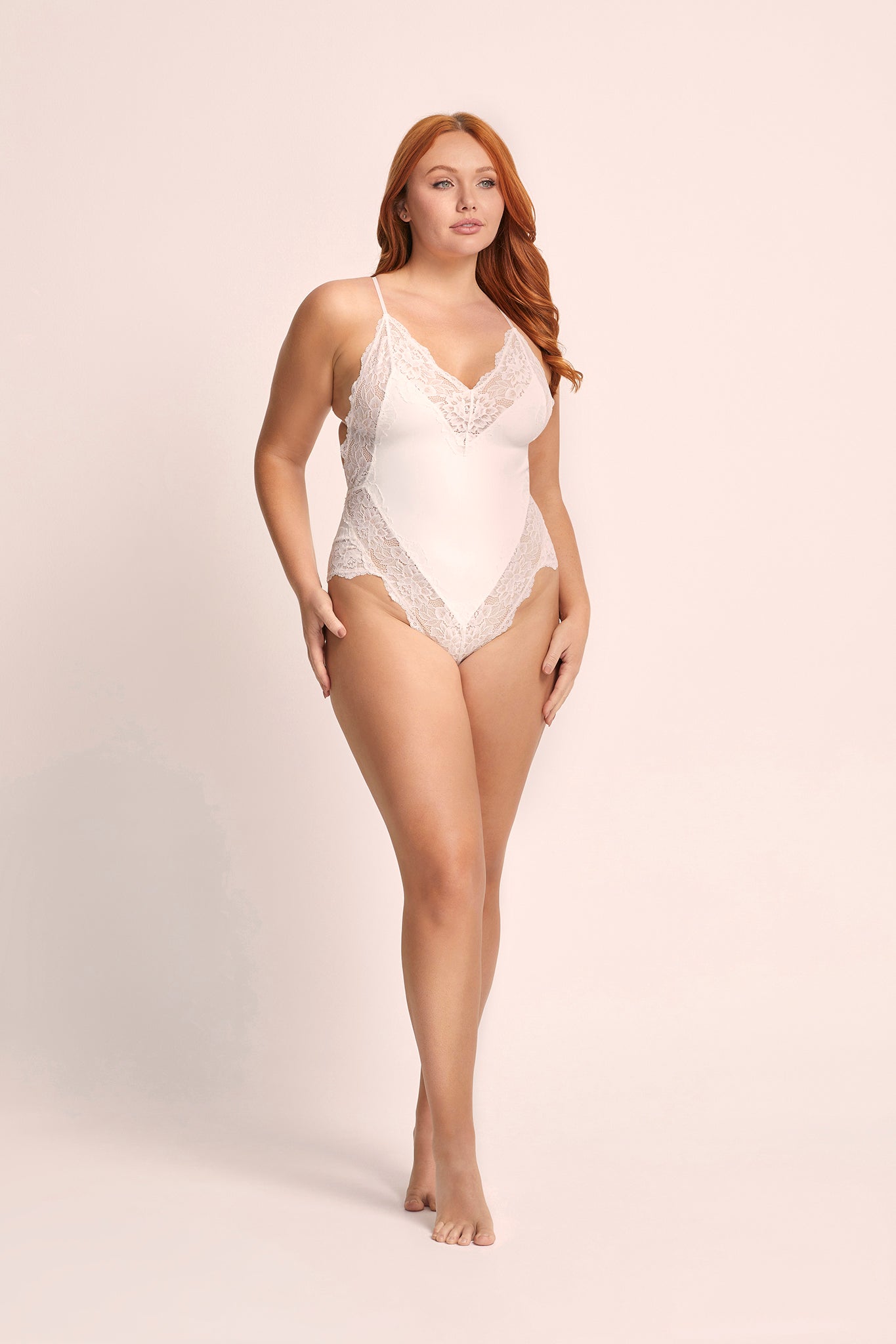 Crafted from luxurious lace and luxe papertouch fabric in pristine white, this bodysuit exudes femininity with a captivating low back detail adorned with an elegant cross-back design. Whether you're wearing it beneath one of our exquisite bridal robes, pairing it with jeans or leather pants, or simply indulging in a day of relaxation at home, you'll look beautiful and feel ultra-feminine. The snap button closure at crotch adds convenience. This bodysuit is the perfect choice for showcasing your style and sophistication on various occasions.