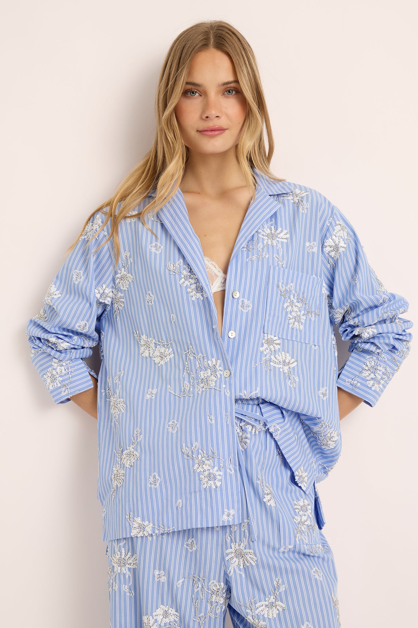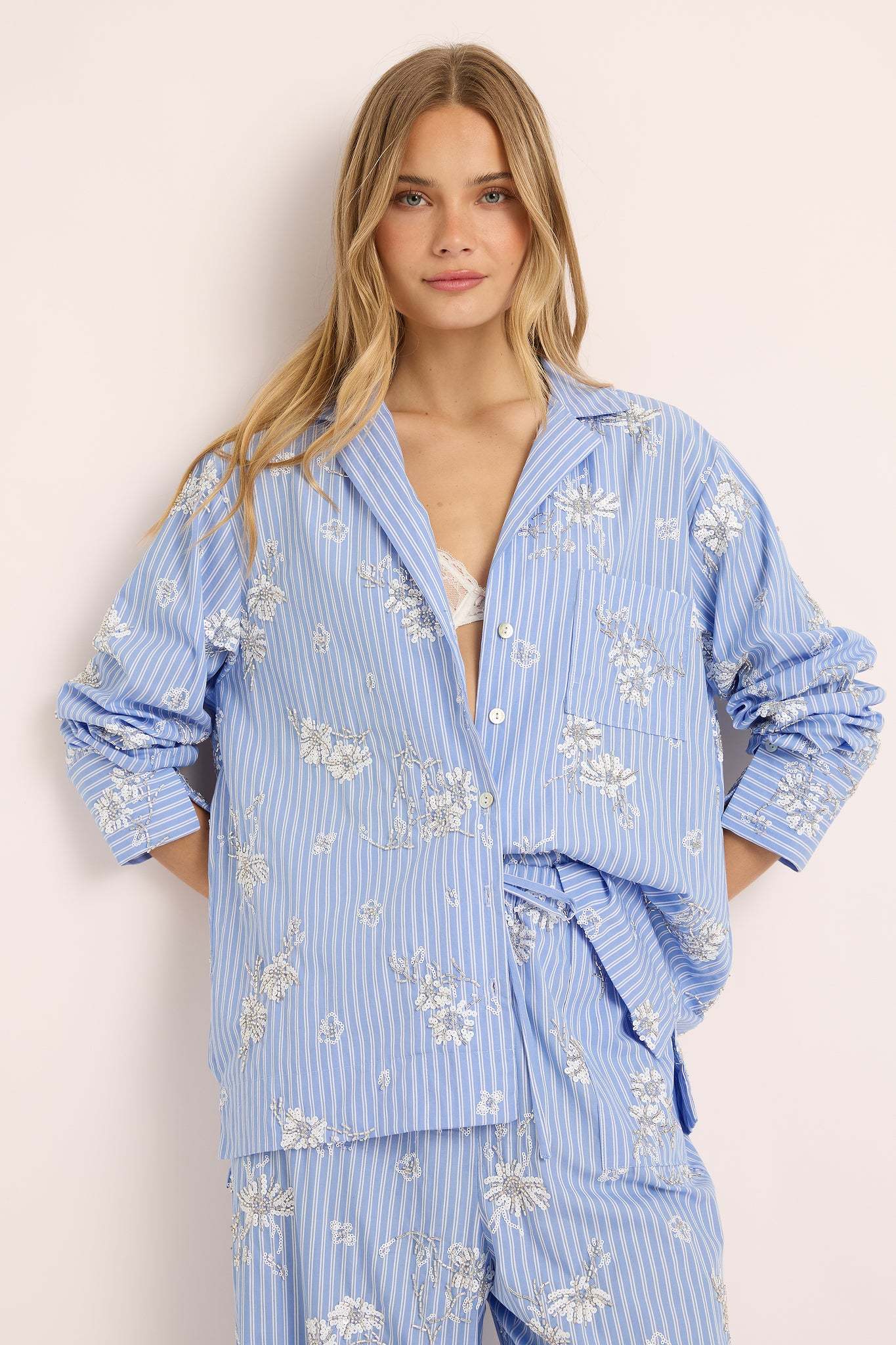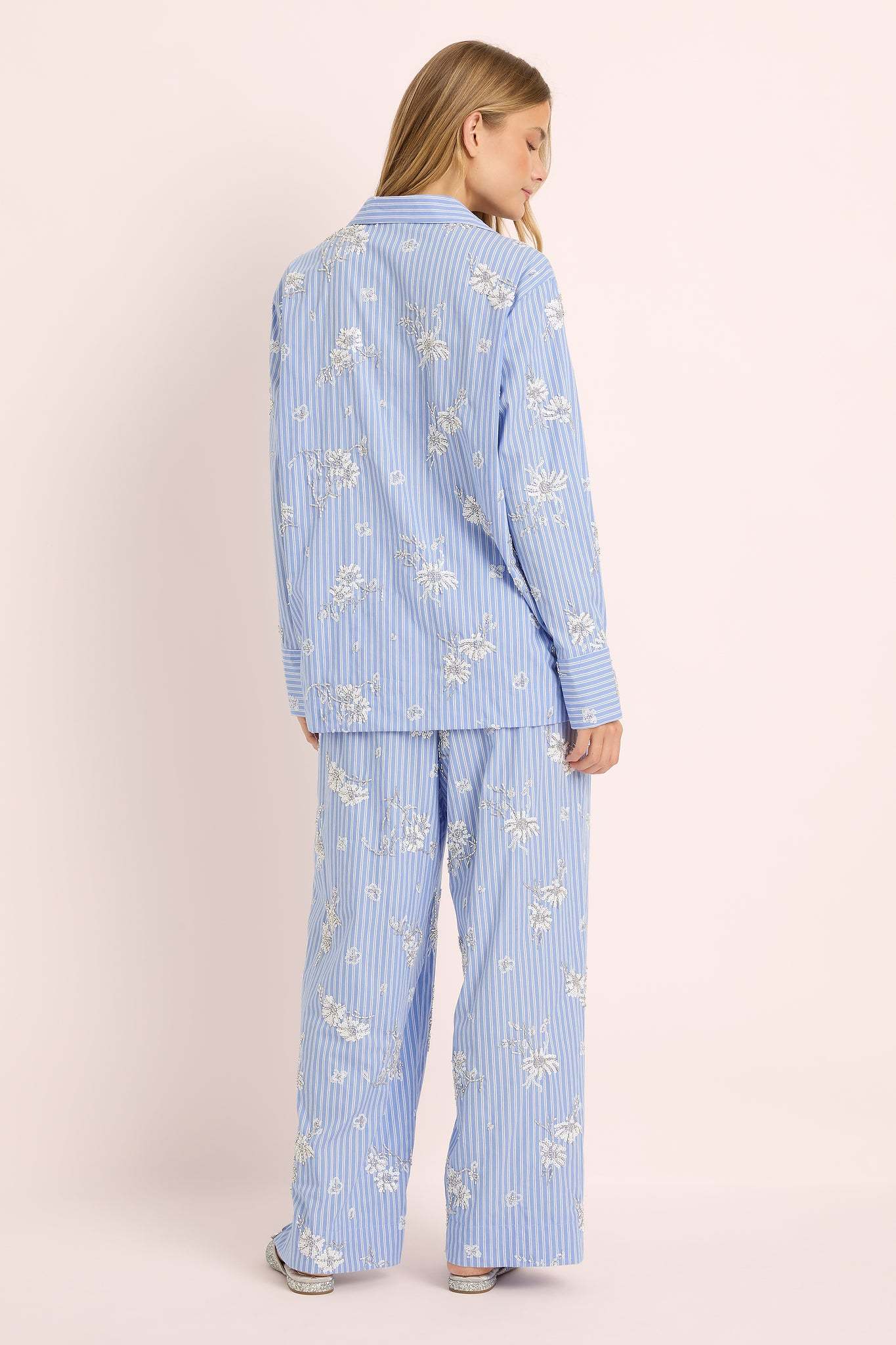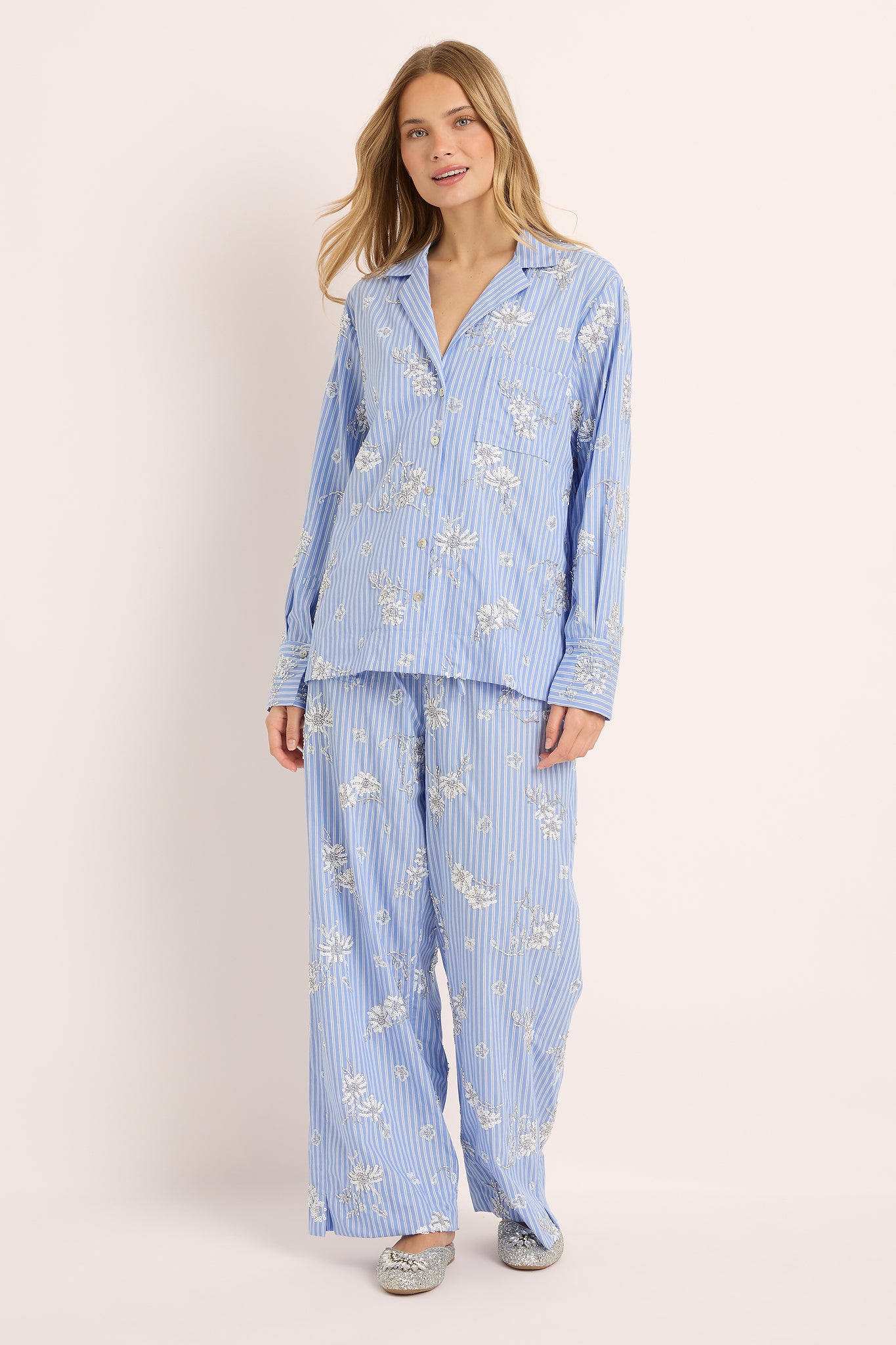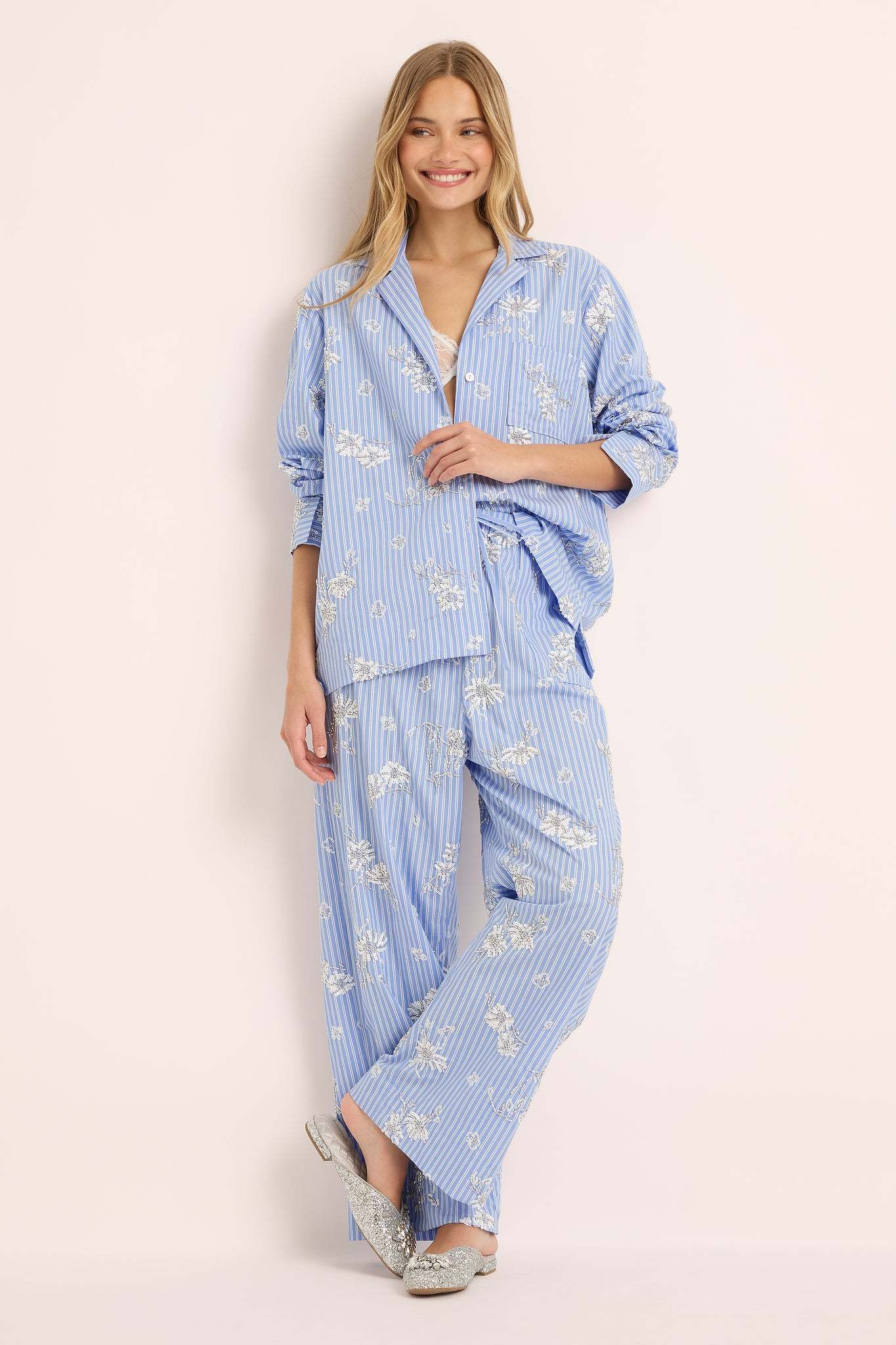 Each detail from the of the subtle shimmer of bead work celebrates artistry and grace. The relaxed button-up shirt and wide-leg pants offer a fluid, flattering silhouette designed to move beautifully from at-home lounging to sophisticated daywear.