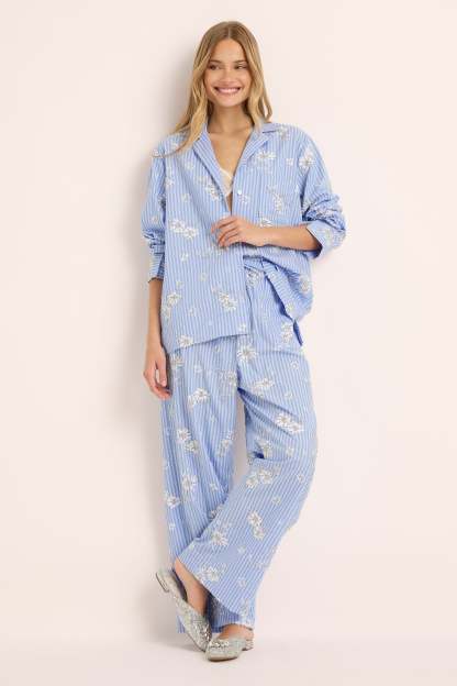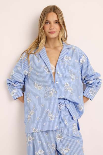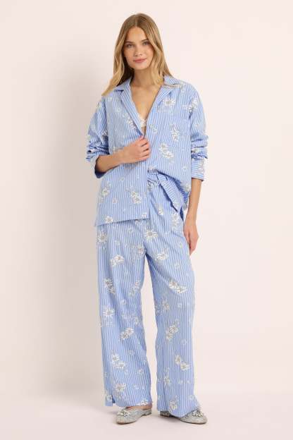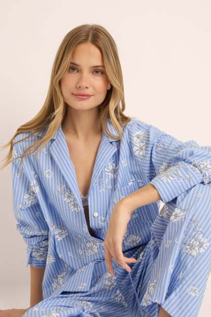 The Homebodii Vivienne Beaded Lounge Set is where timeless craftsmanship meets modern femininity. Made from 100% cotton, this soft blue striped set is adorned with delicate hand-beaded embellishments, transforming everyday comfort into a true statement of style.